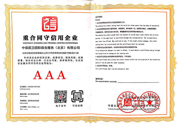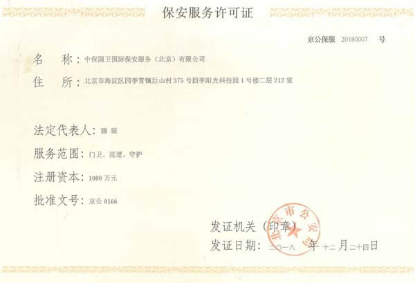 中保國衛(wèi)國際保安服務(北京)有限公司,屬中保國衛(wèi)集團旗下子公司。能全方位的為大型客戶提供優(yōu)質(zhì)的安保、押運服務,是集人防和技防于一體的新型正規(guī)化綜合安保押運服務企業(yè),提供人防、物防、技防、聯(lián)網(wǎng)報*、非武裝押運等安防相關的一站式服務。 公司在國內(nèi)多省設立有分公司及分支機構,著重提升安全押運、智能技術押運及安全技術防范相關的服務,業(yè)務范圍覆蓋全國一、二線城市、港澳地區(qū)以及海外地區(qū)。安保方面主要為政府機構、金融機構、企事業(yè)單位、醫(yī)療衛(wèi)生、高等院校、工業(yè)園區(qū)、大型商場、高檔住宅、智能商務樓、大型活動提供門衛(wèi)、守護、巡邏、押運(非武裝)、安全檢查、保安特勤、私人護衛(wèi)、消防中控、安全技術防范、遠洋護航等全方位服務,同時面向國際市場,為中資企業(yè)在“一帶一路”沿線國家投資提供境外安保服務。 >> 更多內(nèi)容 |